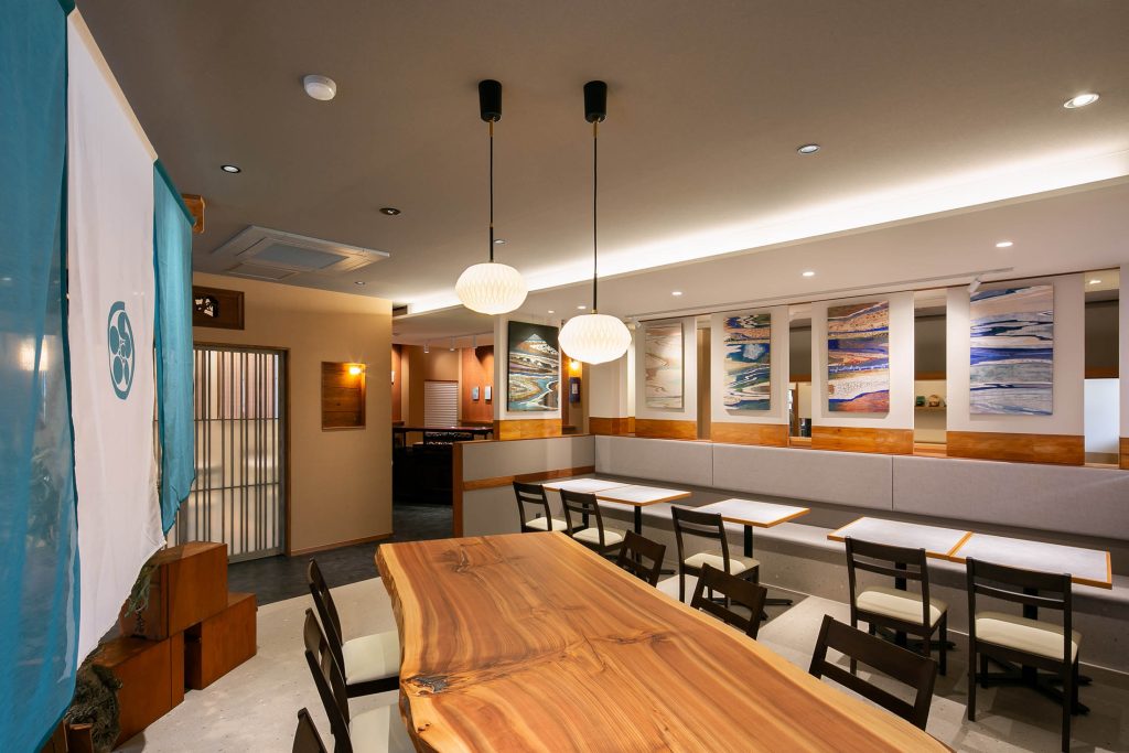 入口には半透明の大きな暖簾を設け、空間をやわらかく仕切りながら視線を奥へと導きます。