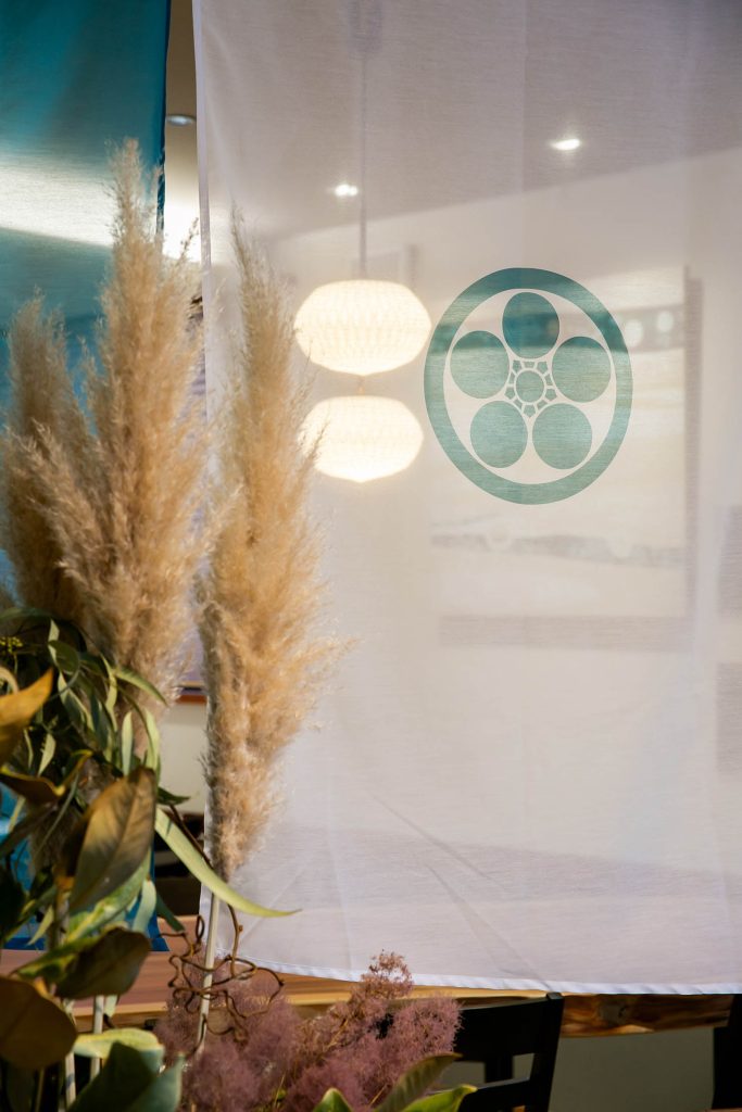 暖簾にあしらわれた家紋は、この店のアイデンティティを象徴する存在として自然に来訪者の印象に残るようデザインしました。